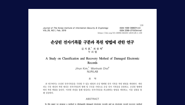 "손상된 전자기록물 구분과 복원 방법에 관한 연구" 2019년 2월 한국정보보호학회 논문에 게재됨